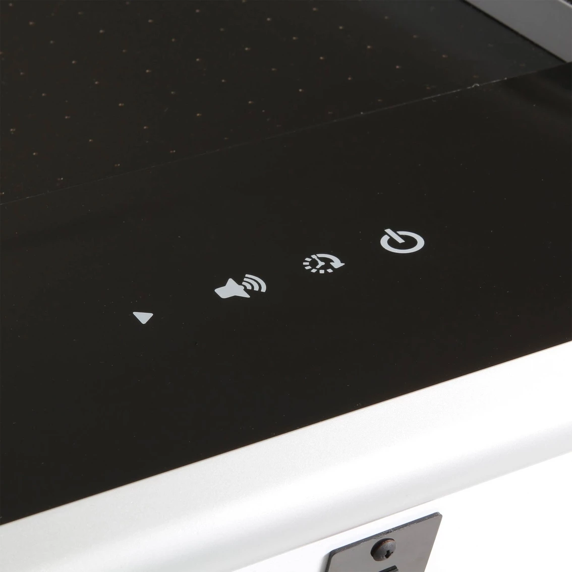 8 ft. air-powered hockey table with 120 V blower motor for fast play. 2.75 x 1 in. side rails with black acrylic surface. 7 5/8 x 1 in. end rails with black acrylic surface. 1 in. MDF Playbed with high-gloss polycoated surface 9 in. legs with massive cross-brace support for added stability. 5.5 in. leg levelers for uneven floors. New touchscreen style controls inside acrylic rails. New LED scoring inside acrylic rails. Includes (2) Premium Ergonomic Strikers and (2) Red 3.25 in. Pucks. Model: G04864W.