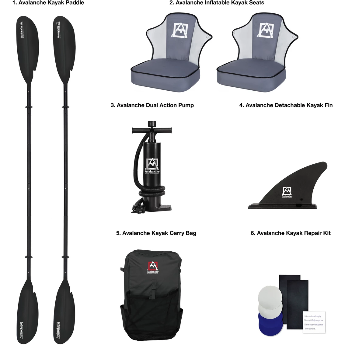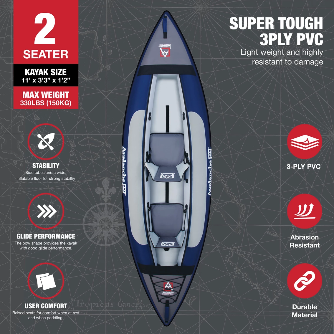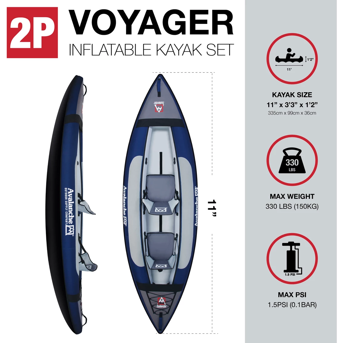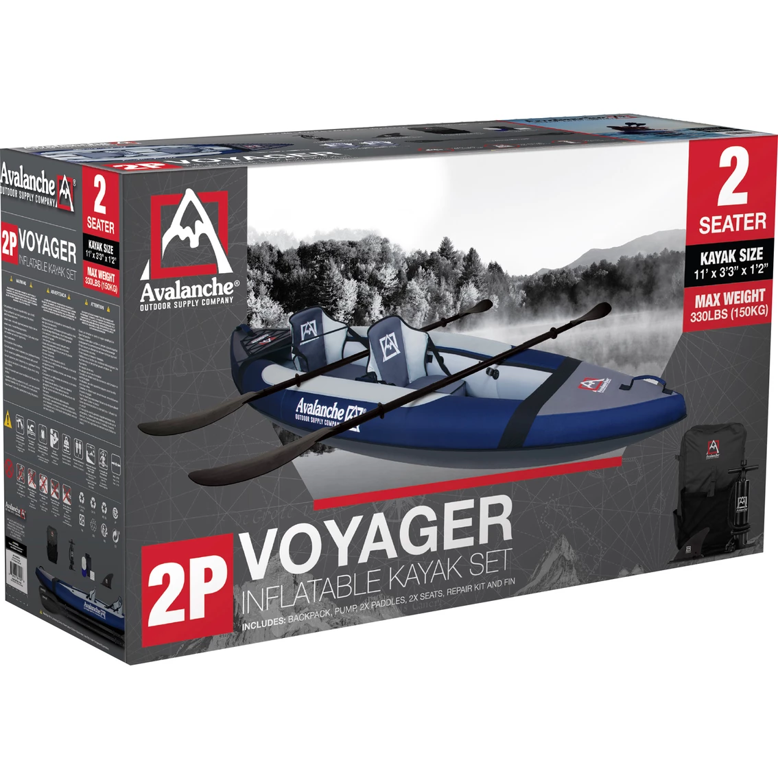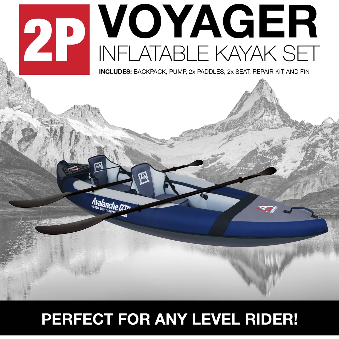 Sail into new adventures with the Voyager 2-Person Inflatable Kayak Set from Avalanche! It includes a pump, fin, bag, 2 kayak seats and a paddle. Model: AVA-YAK2PBLU.
