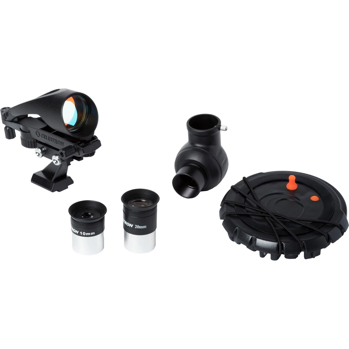 The lens cap has an integrated smartphone adapter built into it. Place your smartphone against the rubberized friction surface on the outside of the cap so your camera is viewing through the imaging port. Secure the smartphone using the two adjustable bungee cords. The inside of the lens cap has a fitting that secures to your eyepiece using two set screws. Voila! You are now ready to take high power images through the telescope.