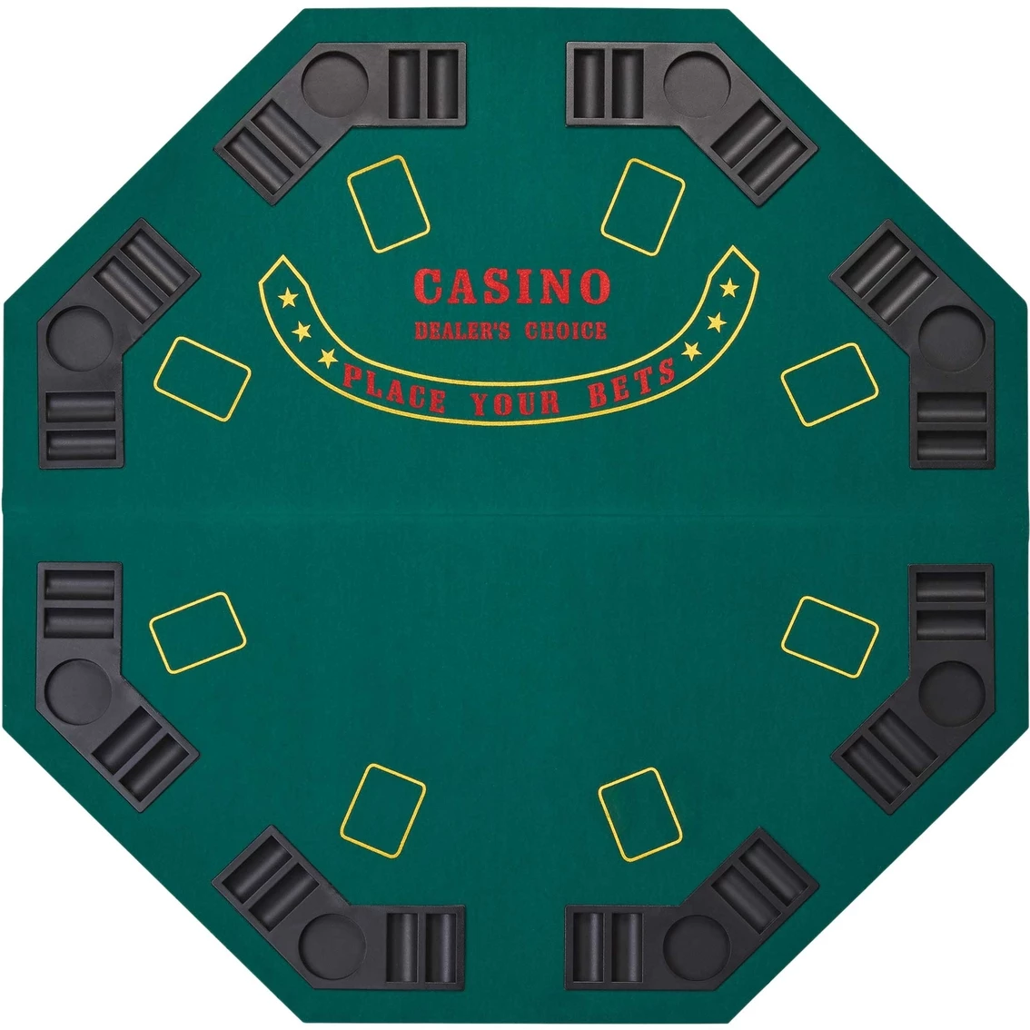 This Fat Cat Poker / Blackjack Tabletop is a colorful felt playing table that easily unfolds and lies flat on any surface. Tabletop comes with eight built-in poker chips and drink holders. Constructed of solid wood. Includes a carrying case. Model: 64-2004.