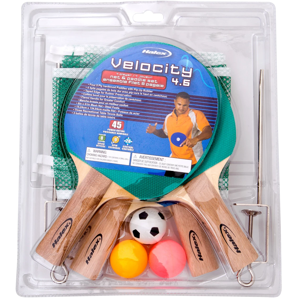 This set from Hedstrom will complete your family game room. Table tennis encourages exercise and coordination and is fun for the entire family. The set features four 5-ply paddles with pip-up rubber, taped edge for rubber preservation, flared handles for greater comfort, 6 in. x 61 in. mesh net, steel posts and three recreational table tennis balls. It is suitable for ages 12 years and up. Warning: Choking Hazard — Small parts. Not for children under 3 years old. Model: G0029807573005.