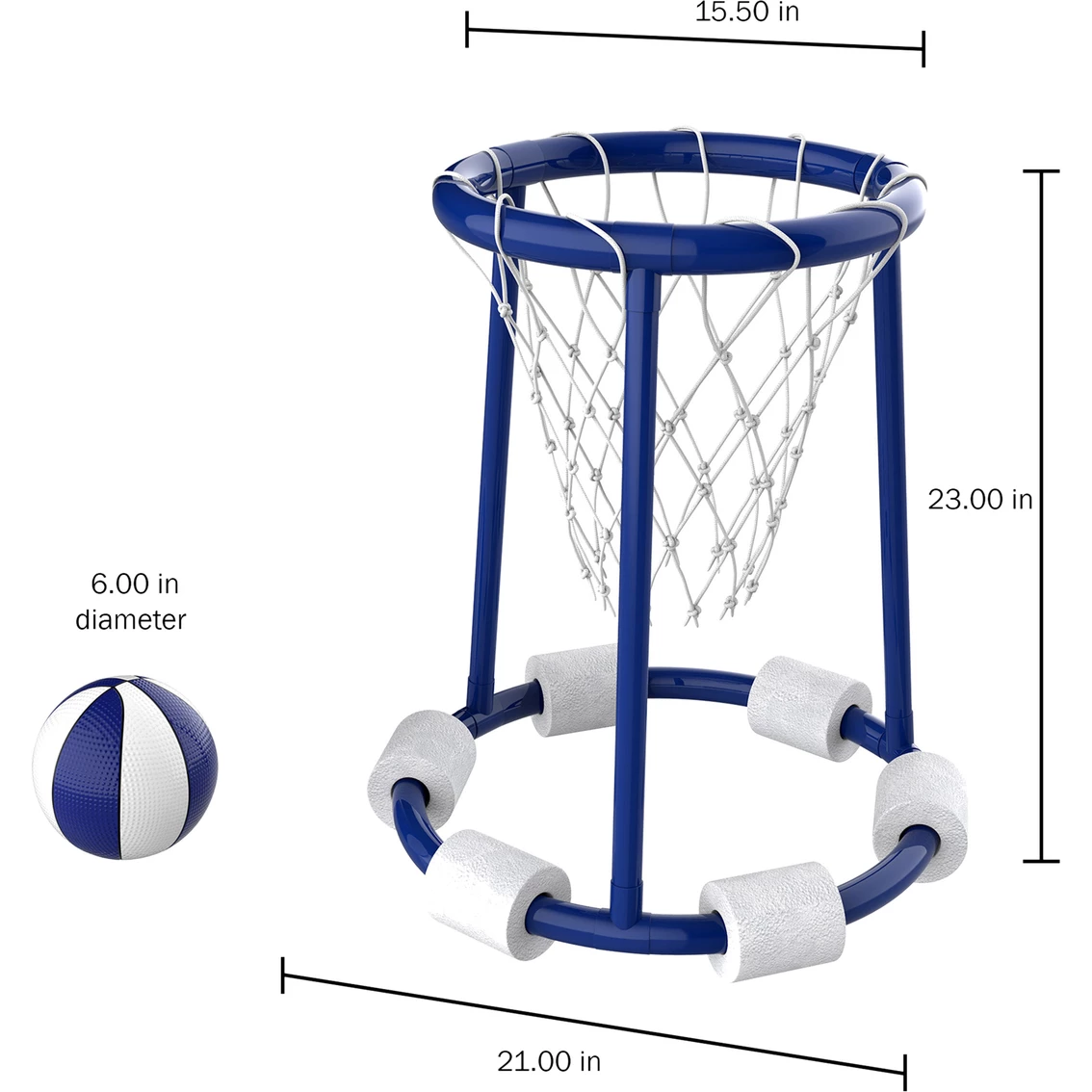 - Product Details: Material: PVC tubing. Overall Dimensions: 23 in. H x 21 in. diameter; Hoop Opening: 15.5 in. diameter; Ball: 6 in. diameter. Set includes hoop with 6 foam flotation pieces, net, ball and air pump.
