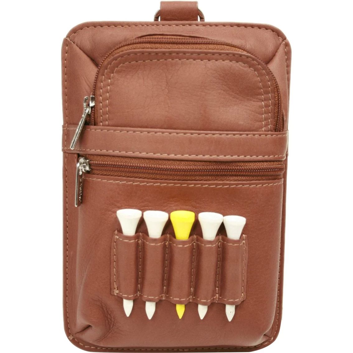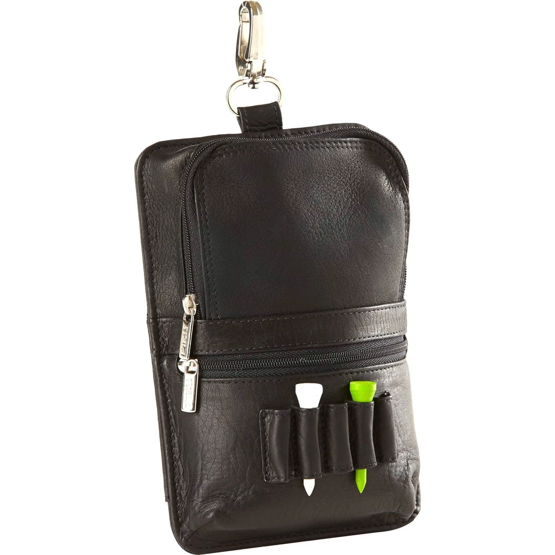 The Piel Leather All In One Golf Pouch is just want you need for keeping up on the golf course. This pouch features a rear window pocket and pencil slot for keeping up with your scorecard. Front tee holders and a zip-pocket. Main zippered compartment for your valuables or golf balls. Snap hook for easy bag attachment.