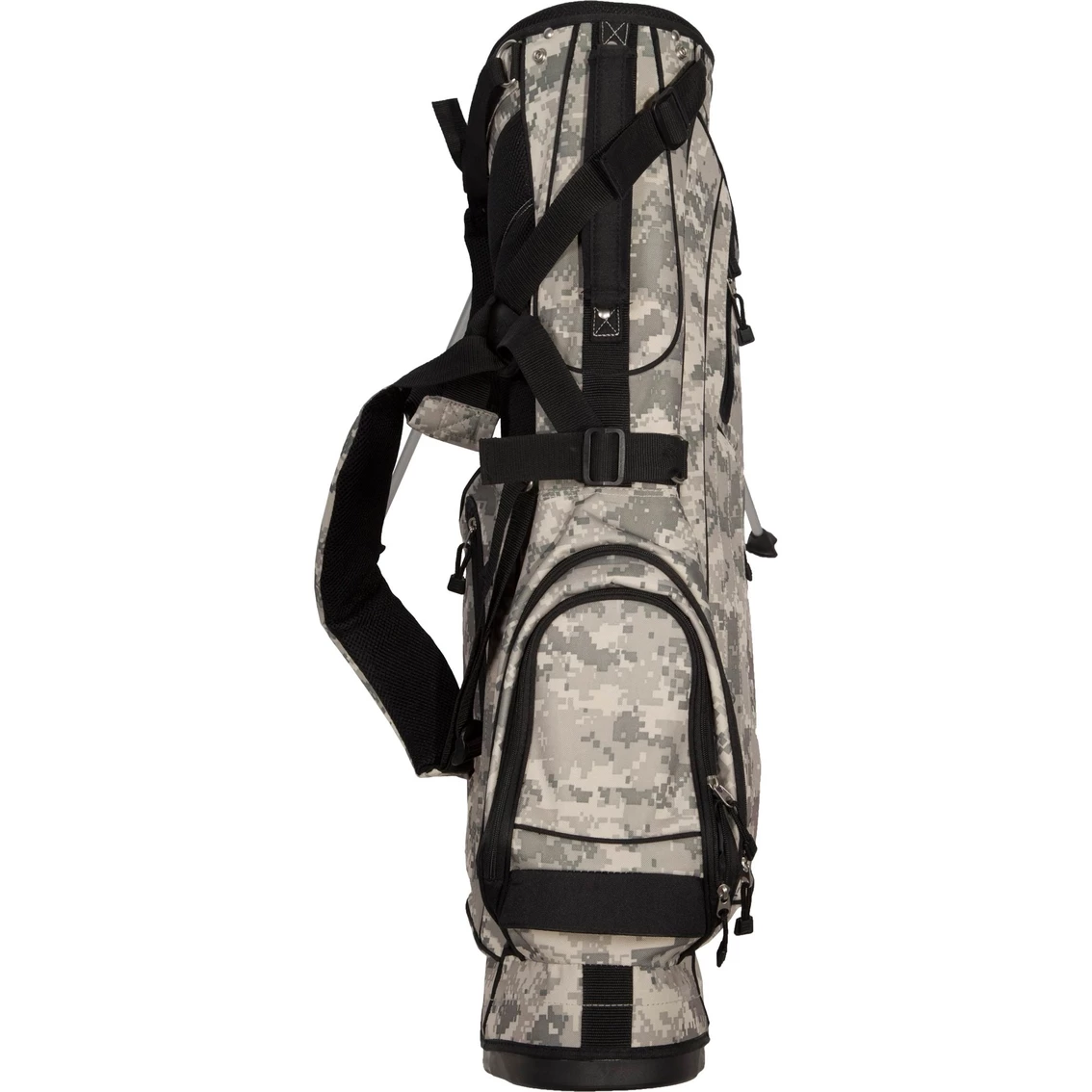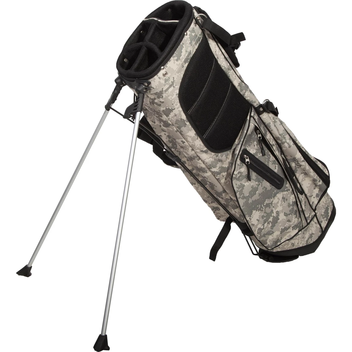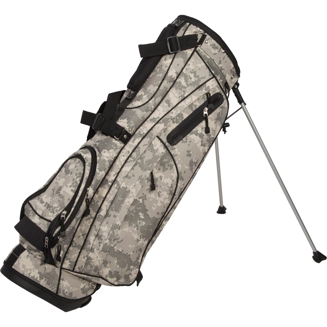 Digital Camo Stand Bag – Multi Pocket. The Courier Digital Camouflage Stand Bag is lightweight (5.3 lb.) and has 7 easy access pockets. The “Military Digital” style camo pattern is flexible and stylish! The dual strap carry system, 6-way lined club divider, micromesh top and velour lined valuables pocket provides a great solution if you are in the market for an awesome stand bag. Comes complete with an integrated kick stand, insulated beverage pocket, rain cover and umbrella holder.