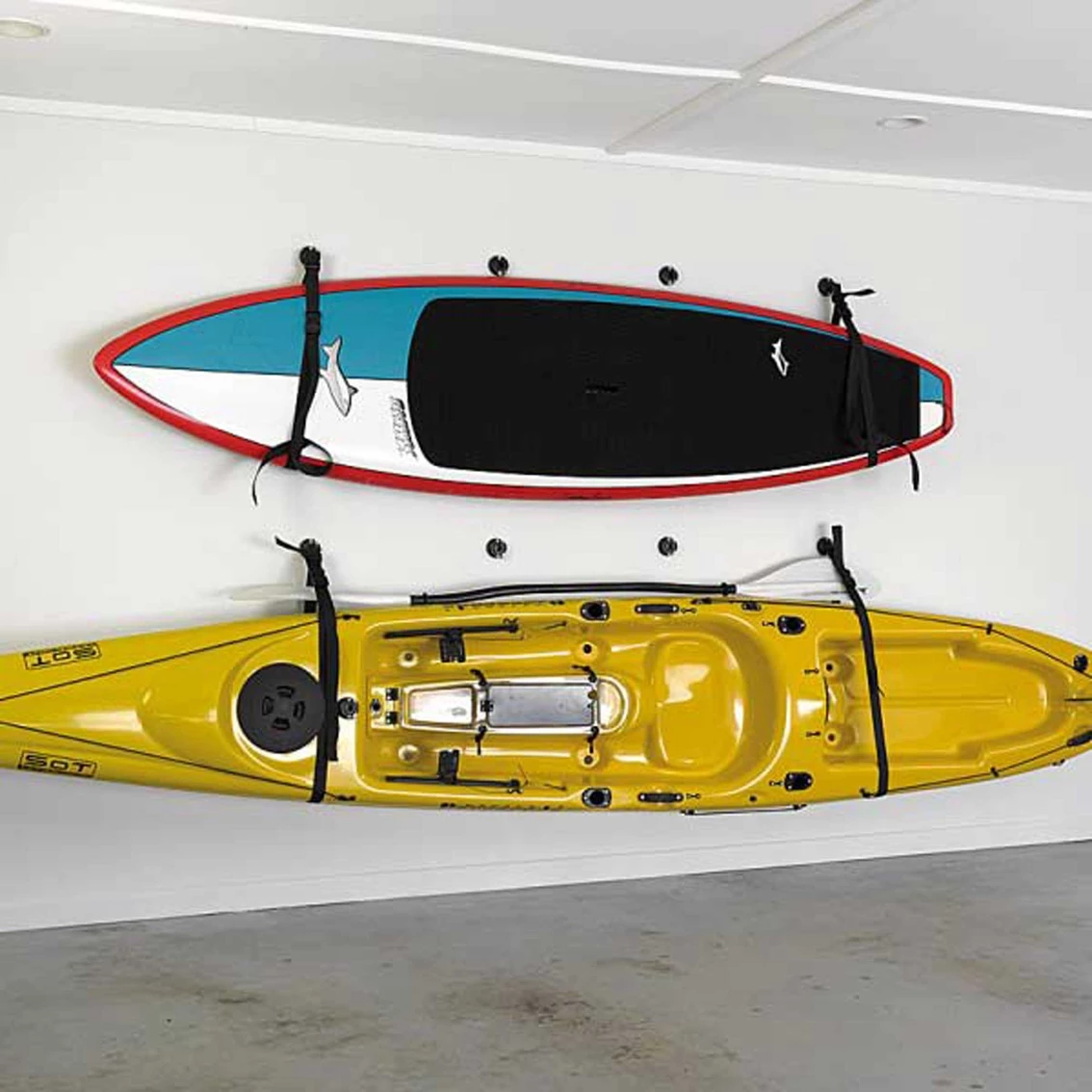 The Rail Blaza Wall Sling will free up space in your garage, shed or yard by allowing you to hang your boat on the wall. You can hang it outside on one pair of StarPorts to wash down and then easily transfer it to another pair of StarPorts inside to keep it warm and dry! If you want to use your sling at another location like your holiday home itโs as cheap and easy as fitting two more StarPorts. Installed in minutes and supplied with StarPorts, slings, adjustment buckles and screws; the Rail Blaza StarPort Wall Sling is great value for money Carries kayaks or Sups up to 100 lb. Model: RBWS.