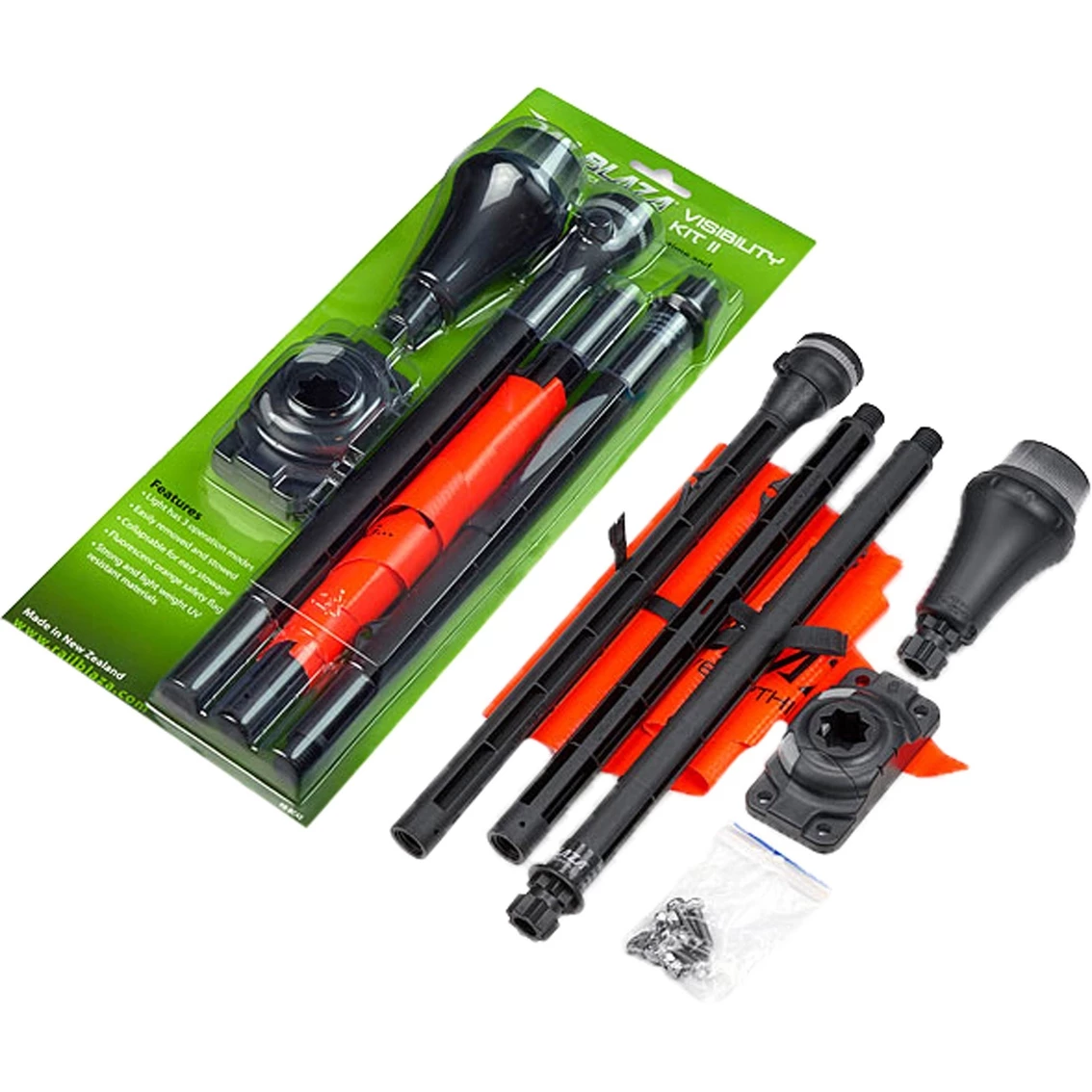 The RailBlaza Visibility Kit II is a must-have safety item for any kayaker, canoer or recreational paddler. In one convenient, value-for-the-money pack, you get everything you need for your kayak or canoe to be seen on the water day or night. This kayak light and boat stern light is Imana approved for Marine use. Simply mount the StarPort HD with the supplied fastenings, lock in the 3-foot ExtendaPole 1000, clip on the orange fluoro flag for daytime visibility, and lock the Illuminate i360 – all-round white navigation stern light into the port on top for safety and regulatory compliance at night.