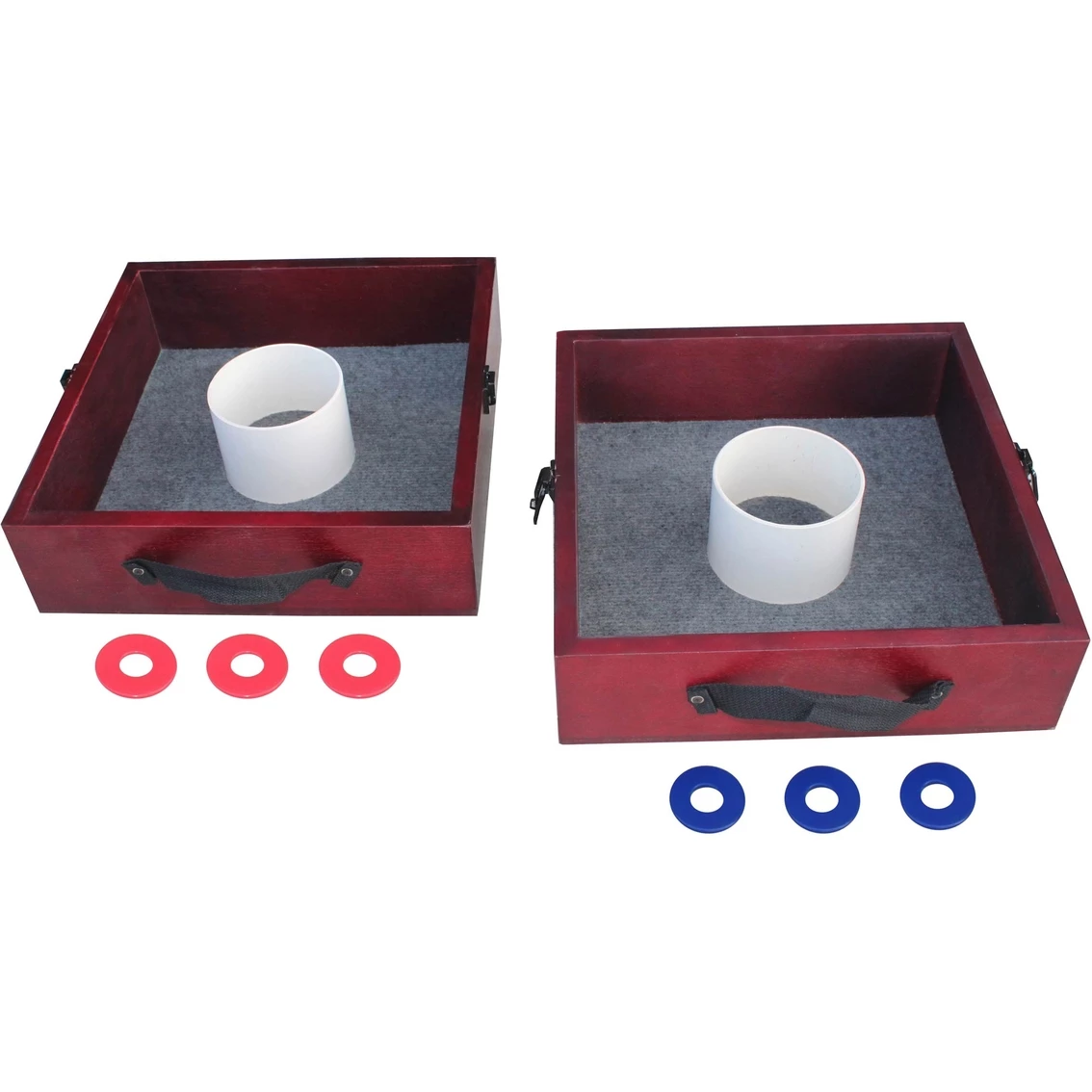 Seemingly simple, washer pitching is actually quite a challenge! Any way you spin it, the Tournament Washer Toss game is small in size and big on fun. The handsome wood boxes lock together to keep all of the components inside, and feature attached carrying handles that make portability easy. Better yet it that game play is even easier! Set the boxes apart from one another and take turns tossing your washer into the cup (that will get you 3 points). If you get the washer inside the box, but not in the cup, that’s 1 point. The first player to reach 21 points wins. Model: 35-7069.