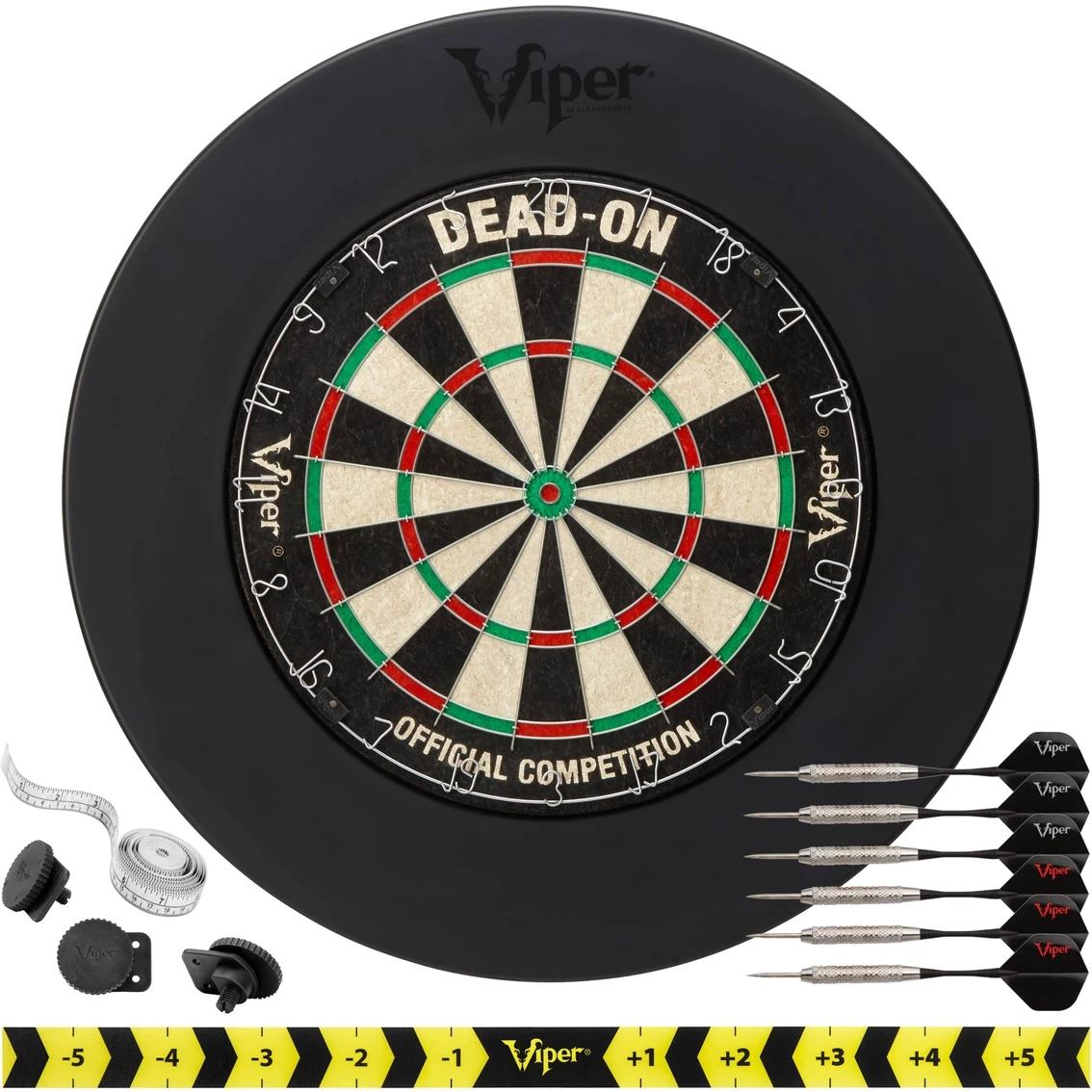 This ready-to-play dartboard set includes the Viper Dead-On Dartboard and the Viper Guardian Dartboard Surround, black. The Viper Dead-On Sisal Dartboard is a 17.75-in. professional-quality steel tip dart board made with self-healing sisal fibers to ensure a long life. The scoring segments are separated by a triangular steel spider-wire and the inner bullseye is staple-free to help you hit your target, reducing bounce-outs and deflections.