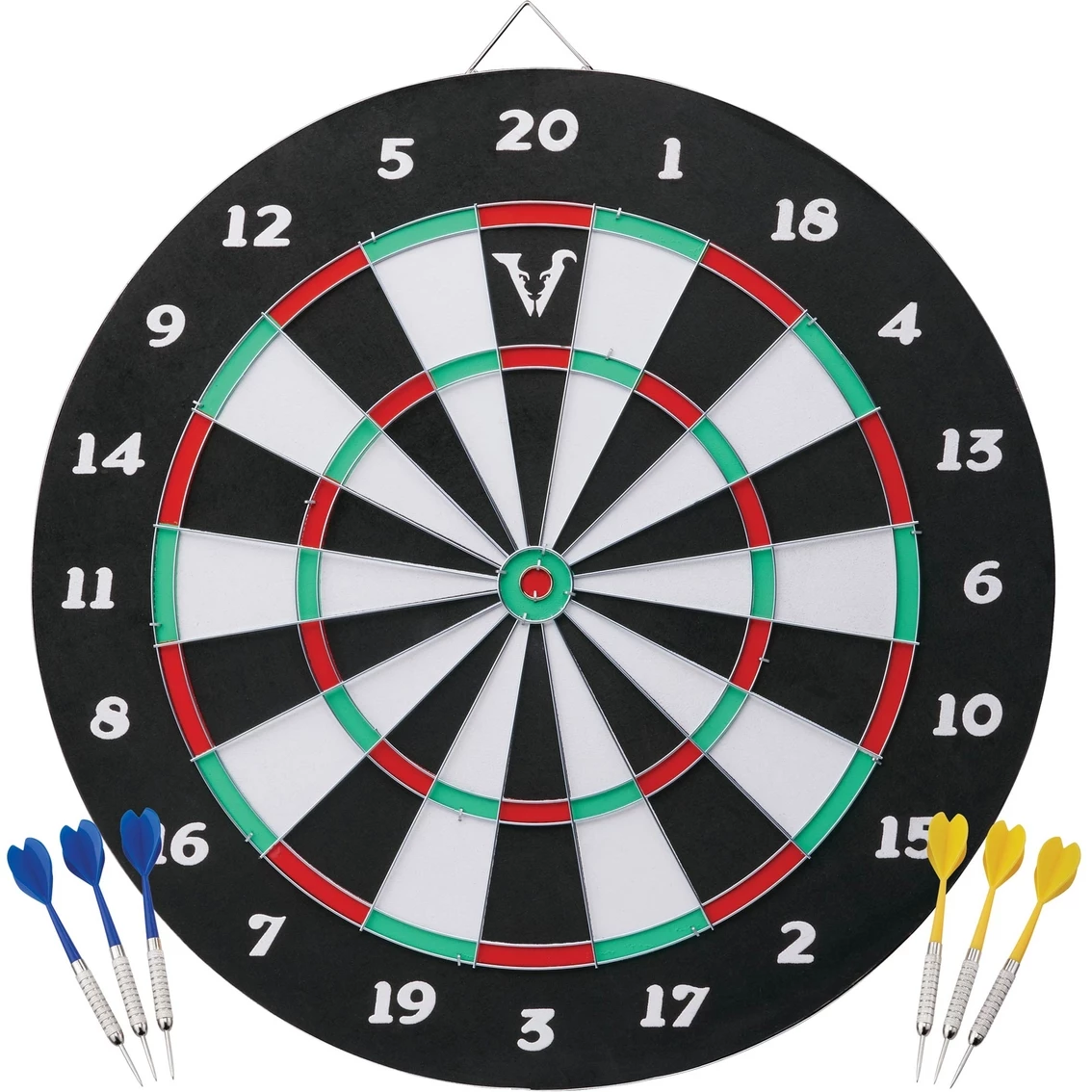 Bring home the fun of darts in addition to a whole new game experience with the Viper Double Play Dartboard, for use with steel-tip and soft-tip darts. This board is sure to bring hours of high-flying fun to your game room, and will certainly turn heads with its distinctive and bright colors. Constructed from high-density coiled paper fibers, this dartboard with stand up to tons of fun and use. This dartboard has twice the games with two distinct patterns. One side is a traditional dartboard with numbers from one to twenty, along with double and triple sections. The spider on this side of the dartboard features round wire to guide darts into the board. The opposite side features a brand new game design: Baseball Darts. Relive America’s Pastime in a whole new way with darts. With an exterior hanging mount, setup is a snap with minimal tools. Included you’ll find playing instructions for popular games like 301 and Cricket, in addition to the rules for Baseball darts. You can get throwing right away with two sets of starter darts. Model: 42-6014.