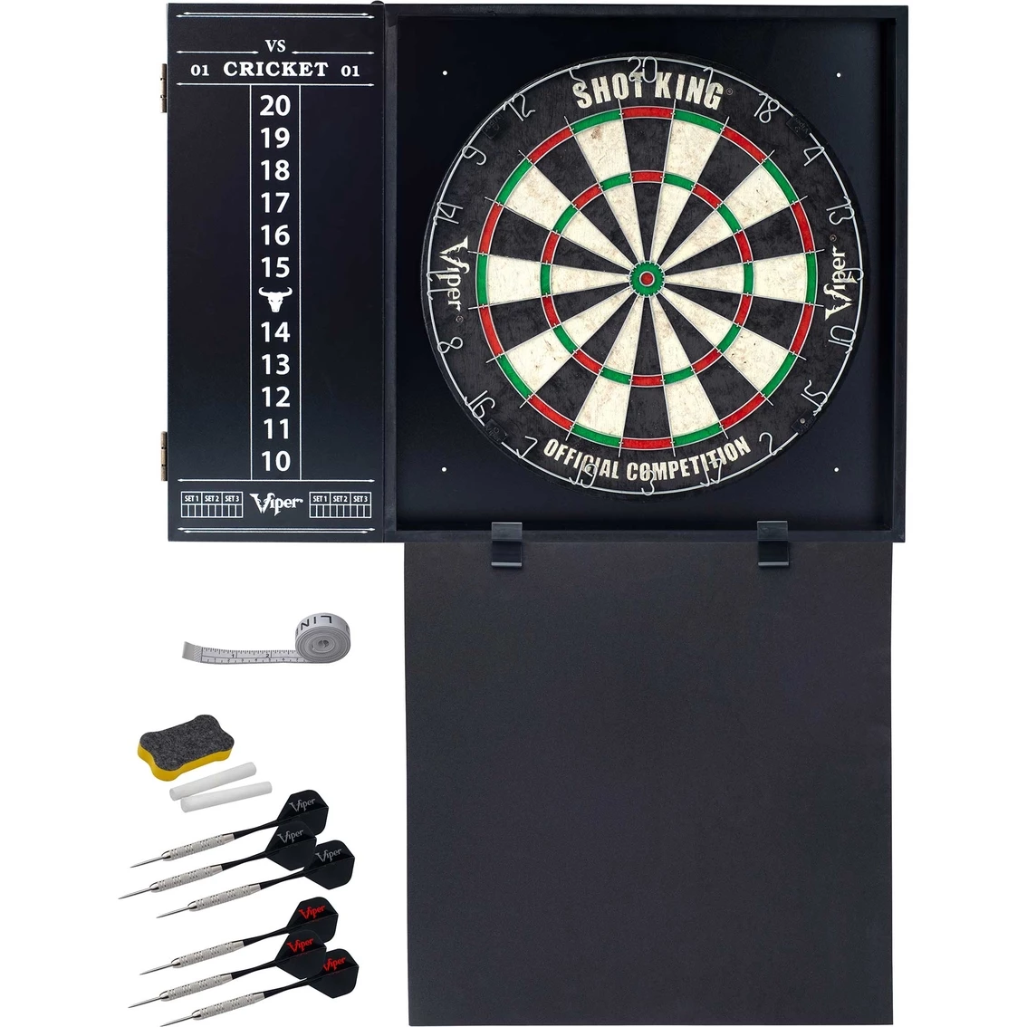 Complete your dartboard experience with the Viper Steadfast Dartboard Backboard Display. Featuring easy installation and expansive coverage, the Steadfast protects your vulnerable wall from errant dart throws. With itβs sturdy construction the Steadfast will last for many a game night. The built-in dart storage cabinet is fit for steel tip and soft tip darts alike, holding up to 12 darts (four sets) in glorious display; additional storage pockets hold extra flights, shafts and accessories. Finally, the cabinet door doubles as a chalk scoreboard, with high-definition graphics printed directly onto the black finish. The Steadfast comes included with a Shot King Dartboard and six starter darts, and a preinstalled mounting bracket. Model: 41-0628.
