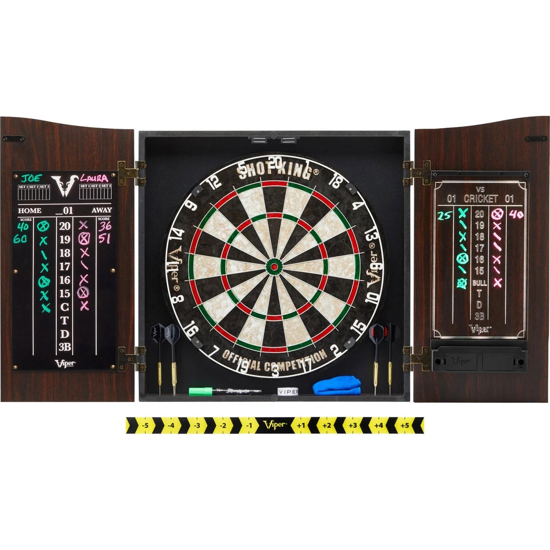 The included Shot King dartboard is a regulation-size 17.75-in. steel tip dartboard made with sisal fibers to last for hours of fun. It features a moveable number ring, allowing you to rotate the board so that you can get the most out of it. This set includes the Viper Vault dartboard cabinet, Shot King sisal dartboard, the Illumiscore Scoreboard, a black dry erase scoreboard, two sets of starter darts, a throw line and a measuring tape. Model: 40-0381.